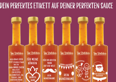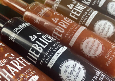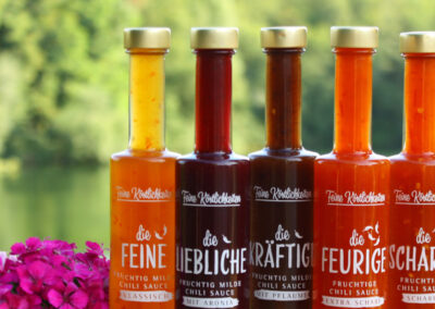 Das Kernstück der Produktpalette bilden die fruchtigen Chili Saucen, die von wunderbar mild bis hinterhältig scharf alles bieten. Umringt werden die göttlichen Saucen von allerlei Außergewöhnlichem, wie beispielsweise die edle Parmesancreme oder die süße Salzmandelcreme. Dabei spielen die handverlesenen, unbehandelten Zutaten in höchster Qualität eine genauso wichtige Rolle wie der Mensch und das Tier die hinter den Rohstoffen stehen.