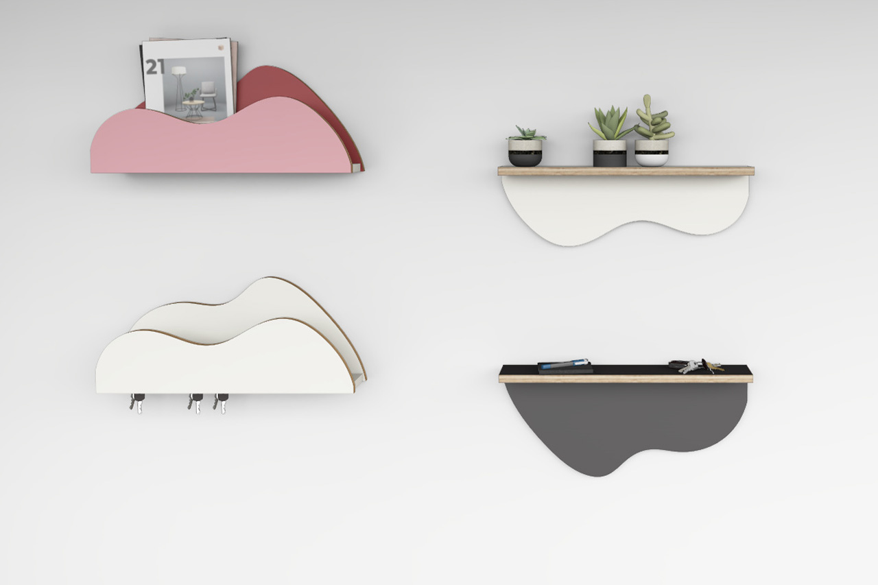 Dazu kommen Kleinmöbel, wie Wandregale und andere Wohnaccessoires, die aus den auffälligen Cut-Out-Schnittresten entstehen, kleine Add-Ons mit großer Wirkung.