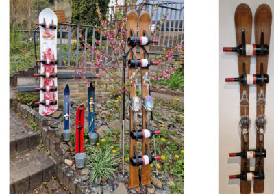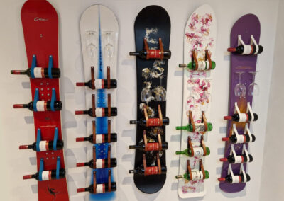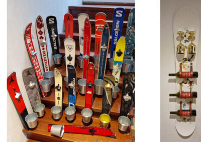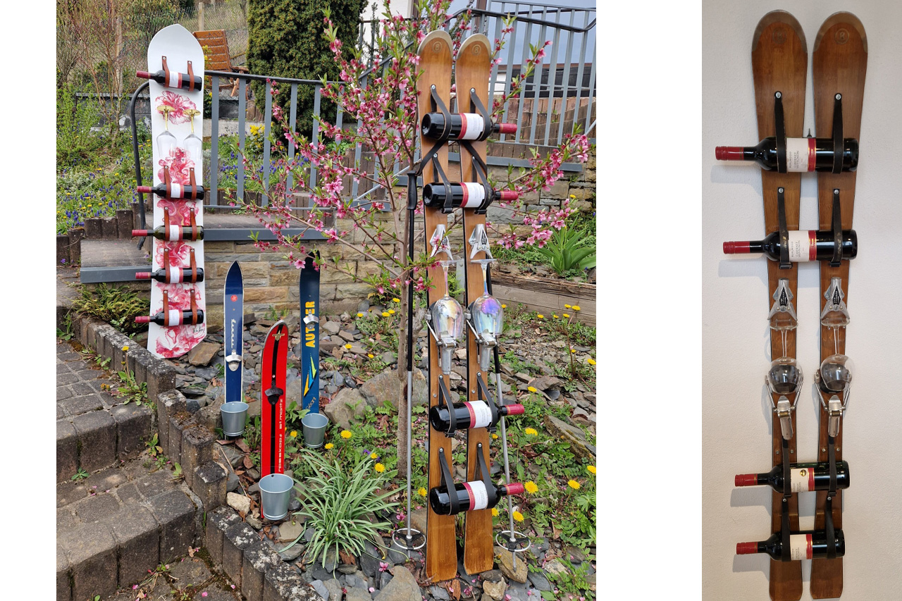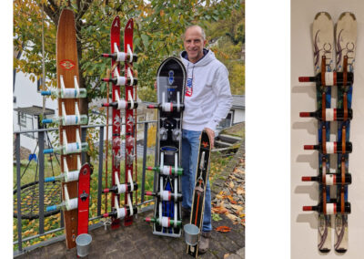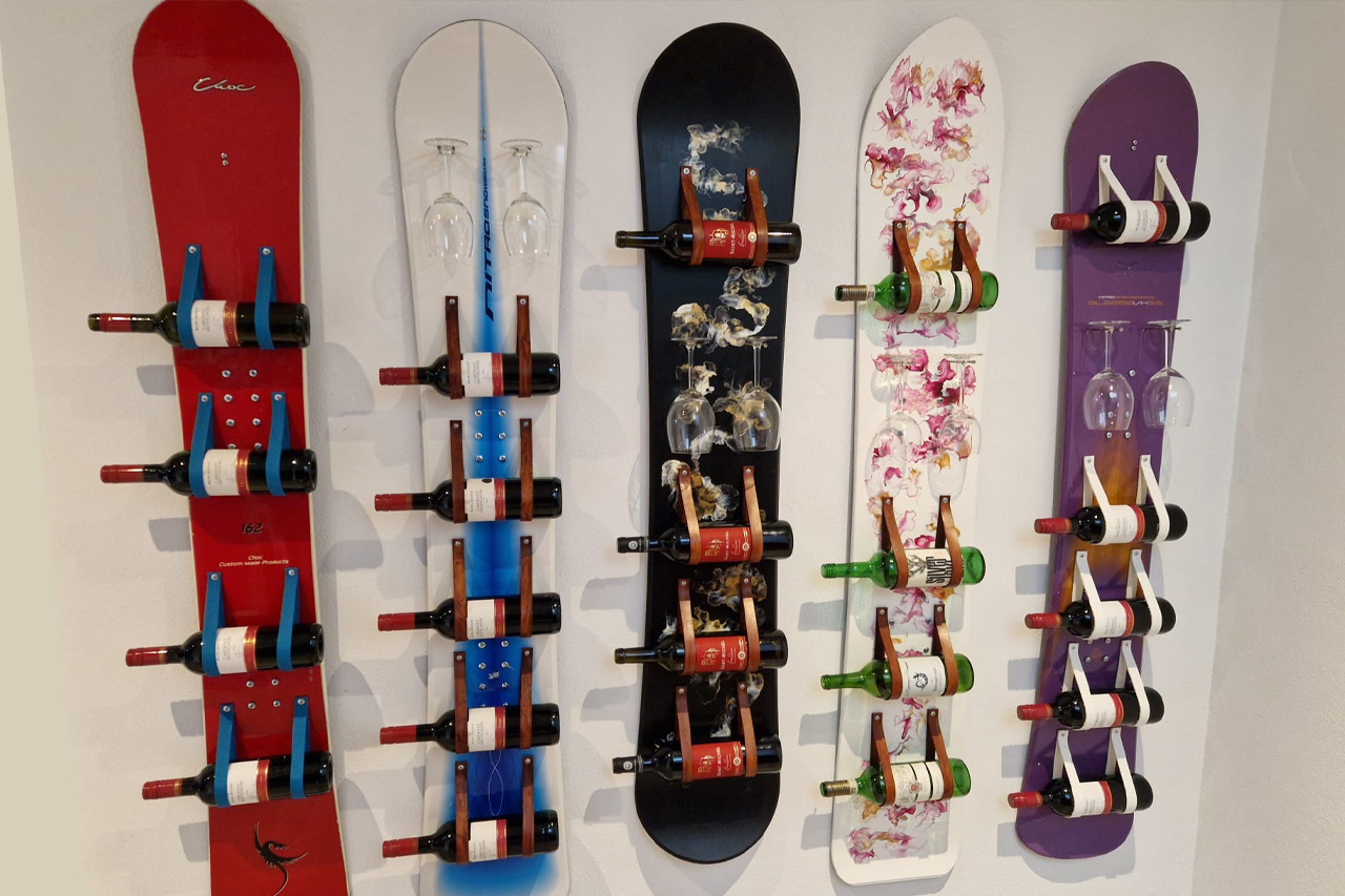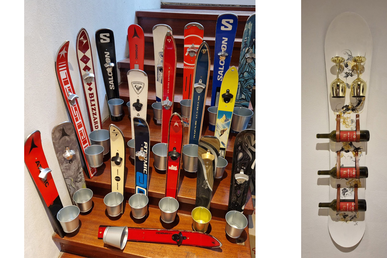 Tomas recycled alte Ski, Snowboards und Wasserski zu stilvollen Weinregalen, teilweise bemalt von Künstlern. Diese können auch individuell gestaltet werden. Alte Skispitzen werden zu Flaschenöffnern mit Auffangbehälter, in vielen Variationen.