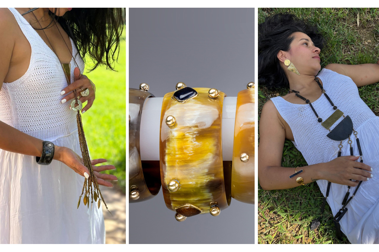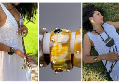 Wir arbeiten mit bewusst ausgewählten Materialien: Messing, Kaolin, recycelten Perlen, Roh- und Halbedelsteinen sowie besonderen Fundstücken.